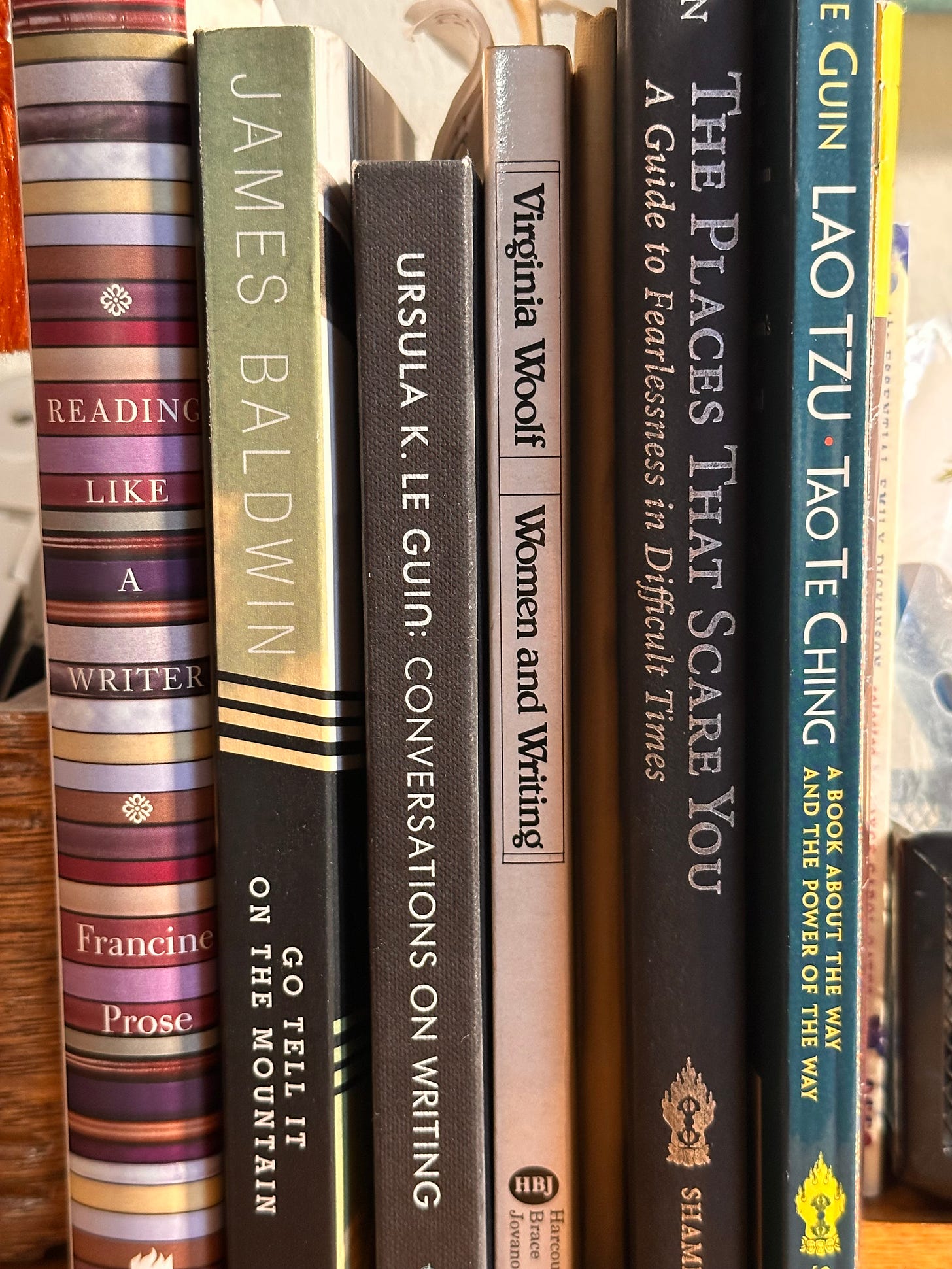 It’s fortunate that today, I only need to sit at my writing desk to find some books whose titles comfort, challenge, and revitalize me. Their spines are coming apart, tea stains dot some pages, pencil scrawls crowd the margins.