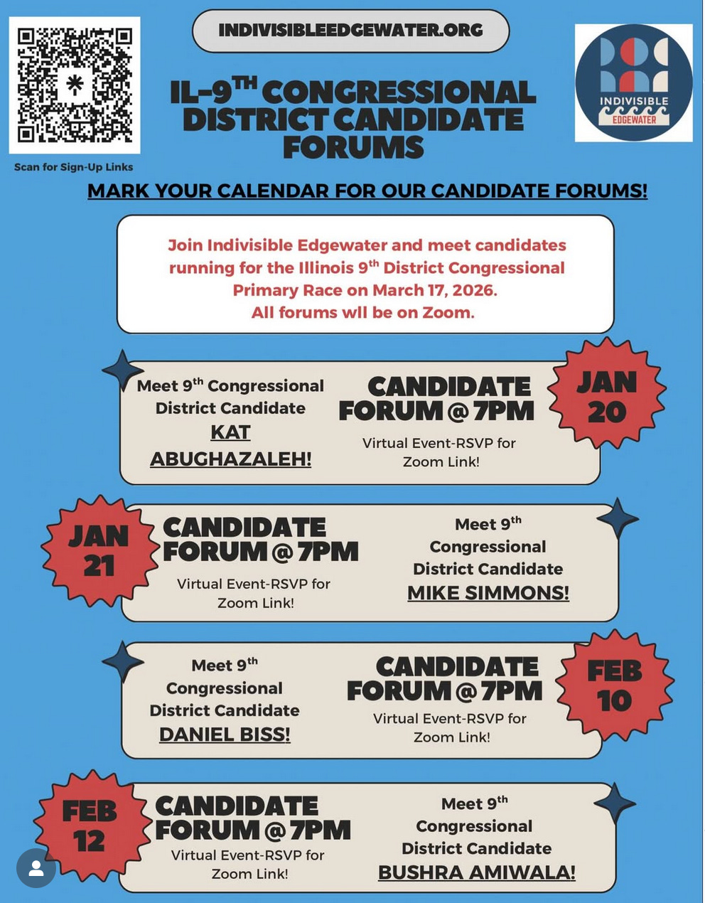 Details are still being finalized but what I love about this setup is there will be no stump speeches; instead, you’ll get real conversation and specifics. Use the QR code below for the registration links.