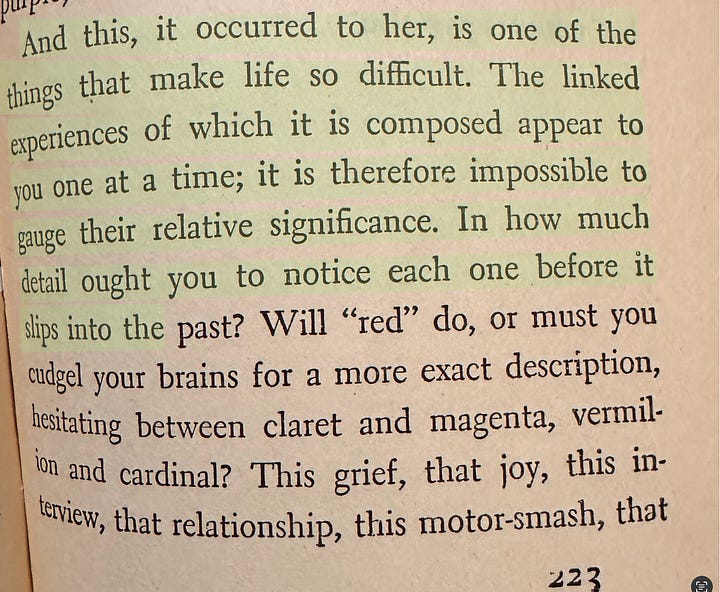 “And this, it occurred to her, is one of the things that make life so difficult. The linked experiences of which it is composed appear to you one at a time; it is therefore impossible to gauge their relative significance. In how much detail ought you to notice each one before it slips into the past?”